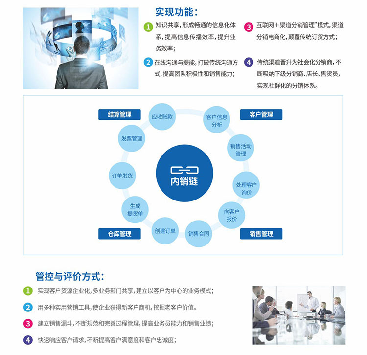 系統特色:實現360度全面了解客戶,通過客戶視圖不僅可以了解客戶的基本信息、聯系信息,了解客戶的業務往來信息,對銷售機會進行精確分析,甄別有價值客戶,從而加強跟單過程控制,提升簽約率。另外銷售跟進與操作評價,有助于銷售團隊的能力提升和潛能挖掘。