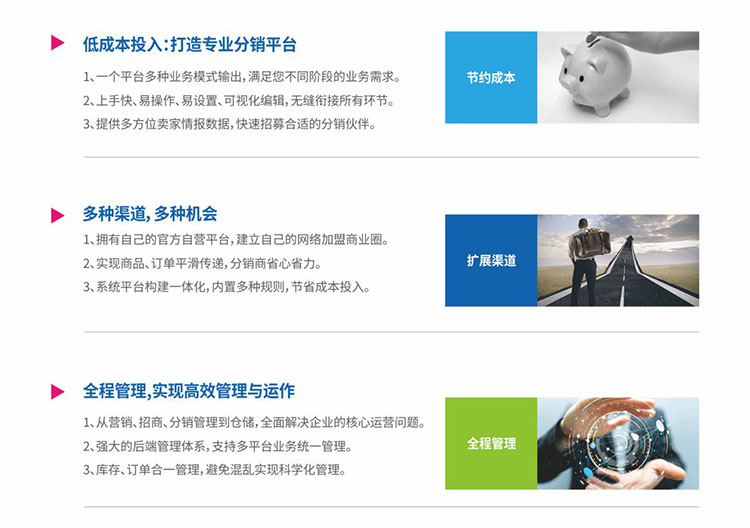 國內營銷戰略涵蓋:分銷渠道管理、級別限制、促銷與返利、虛擬庫存、訂單管理(審核、驗貨、發貨、退換貨)、吞吐量分析、帳務管理、流水管理、對帳管理等。