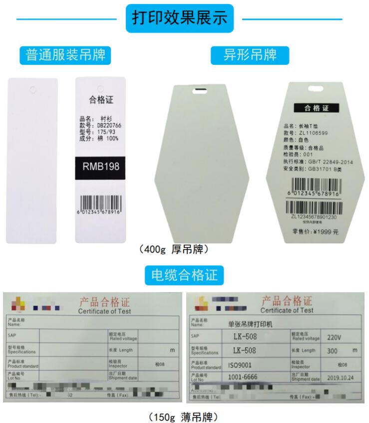 單張服裝吊牌打印機是專業(yè)用于一張張打印單張服裝吊牌,或單張產(chǎn)品合格證吊牌的打印機。它廣泛使用于服裝吊牌、鞋帽產(chǎn)品合格證吊牌。